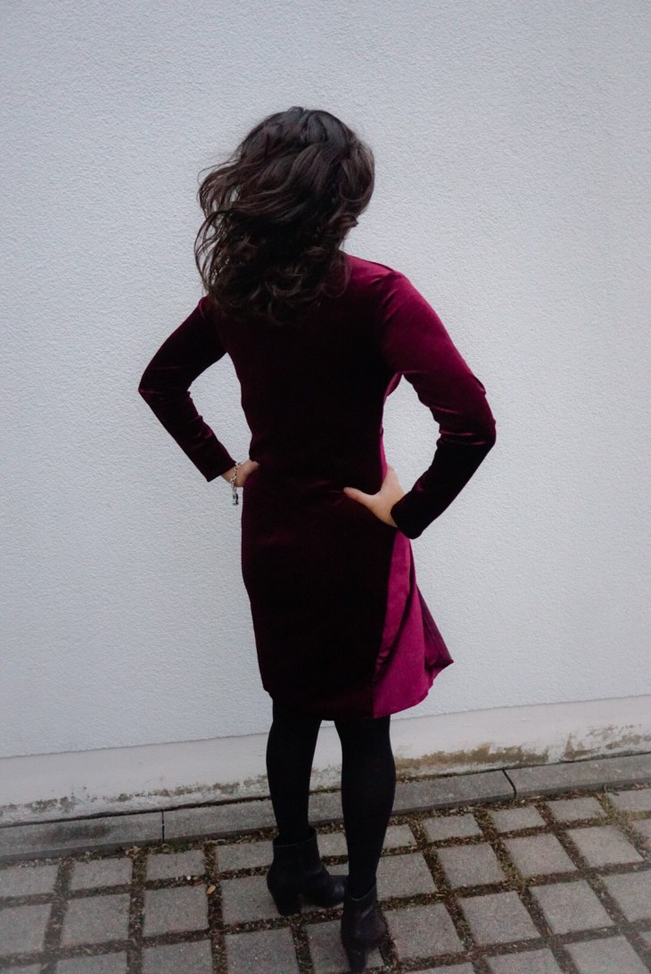 EN: Today, I’d like to show you my Christmas Dress 2018, which should have been my Christmas Dress 2017. I bought the velvet jersey at the yearly Fabric Market in Freising in November 2017 and found the McCall’s pattern /429 at JoAnn’s while I was in America later that month. I washed the fabric, cut out the paper pattern in my size (12)… and then nothing happend for 12 months. I can’t even remember what I wore last Christmas!!!!