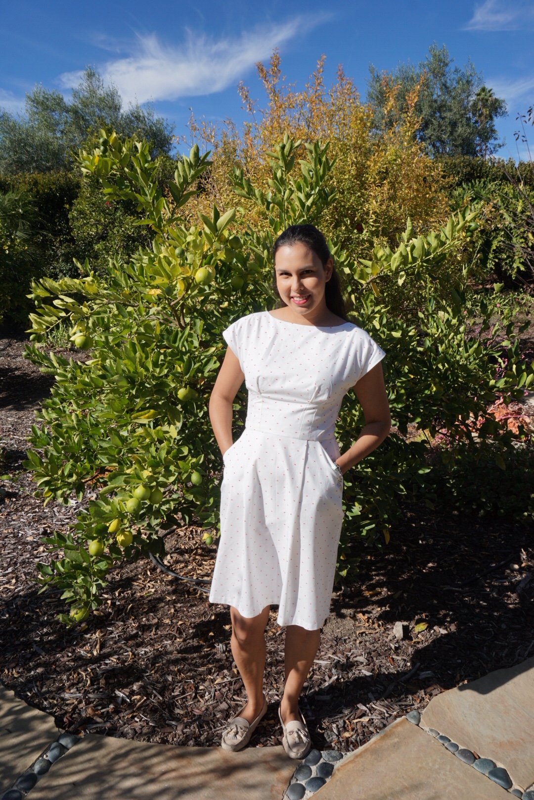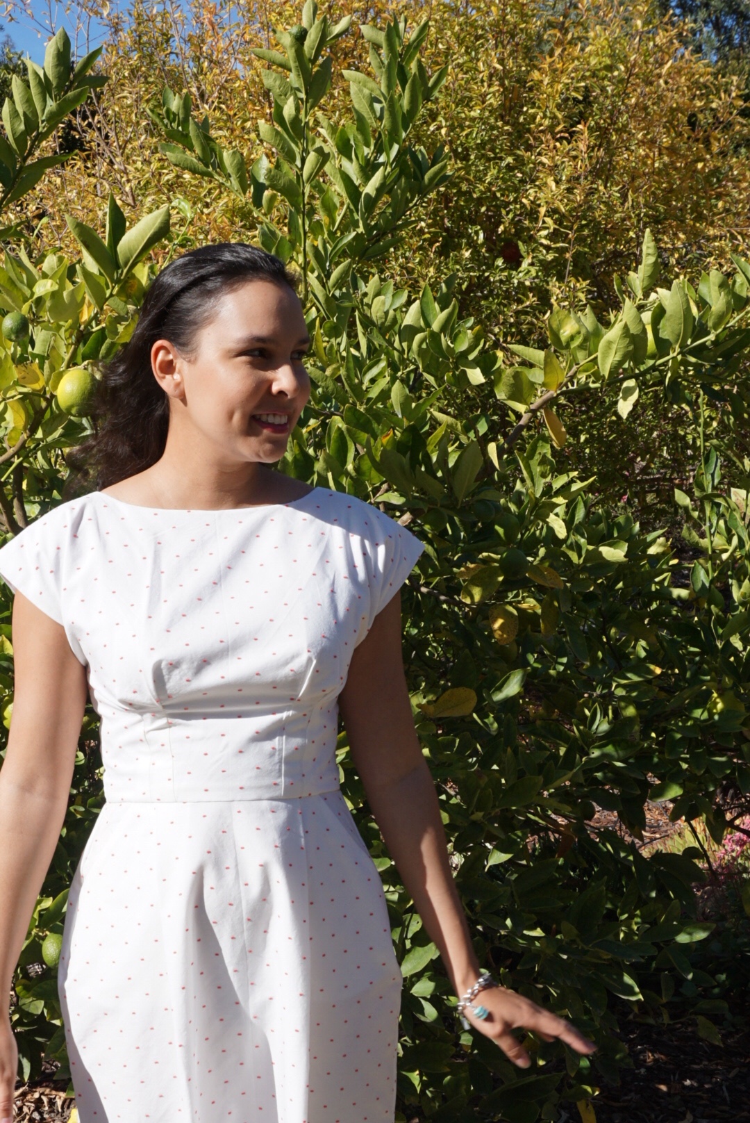 DE: Dieses Mal habe ich Florence in Größe 12 genäht, ich fand, dass es ein wenig an den Schultern gespannt hat und dass wollte ich bei meinem neuem Kleid dann nicht noch einmal haben. Auch habe ich das Oberteil wie immer um 1 Zoll verlängert und habe kleine rote Knöpfe von Stoff und Stil benutzt um dem Kleid ein bisschen pfiff zu geben. Mir gefällt das Kleid auch wirklich gut und habe es schon 2 Mal angehabt!