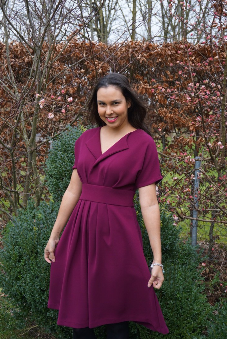 DE: Da ich wollte, dass das Kleid etwas anliegender im Oberteil ist, habe ich mich an die fertigen Maßen gehalten und die gewählt die am nächsten zu meinen Maßen waren (Größe 10). Genäht habe ich Charlotte, aus Beeren farbenem Krepp aus meinem Stofflager,(oh man wie viele Kleidungsstücke habe ich mittlerweile in dieser Farbe genäht??) den ich im Herbst bei Classic Textiles in London gekauft habe. Ich muss Grundsätzlich bei SOI immer das Oberteil um 1 Inch verlängern, ich habe mir aber das Foto von Lisa angesehen und festgestellt, dass das Taillenband unter ihrer Taille liegt und habe deshalb entschieden nichts an dem Schnitt zu verändern.