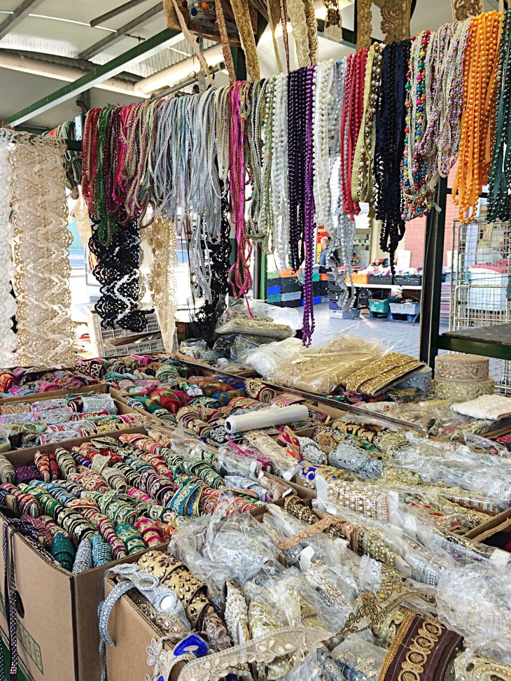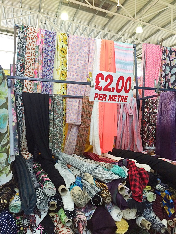 DE: Wir (18 besonders nette Damen) haben uns, um 10:300 Uhr im Tea Room von John Lewis getroffen, um erst einmal eine Tasse Tee zu trinken und ein Stück Kuchen zu essen damit dir dann gestärkt den Stoffmarkt unsicher machen können. John Lewis hat ein kleine aber feine Stoff und Kurzwaren Abteilung, so dass wir erst einmal dort angefangen haben, ich habe 2 Schnitte von Vogue mitgenommen, da sie zum halben Preis zu erwerben waren. (WINNER WINNER CHICKEN DINNER!) Danach sind wir direkt zum Markt geschlendert, auf dem Birmingham Rag Market gibt es so ziemlich alles, was man sich vorstellen kann: Obst, Gemüse, Fisch, Fleisch, Handyhüllen, Teppiche und natürlich STOFFE!