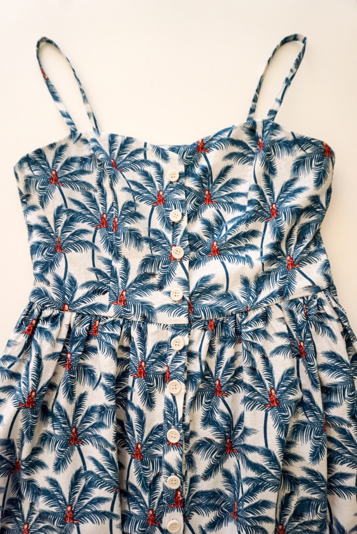 DE: Genäht habe ich es aus einem Baumwoll-Leinen-Gemisch von Fabric Godmother, das ich vor genau einem Jahr gekauft hatte. Mir haben die Affen in den Palmen so gut gefallen, aber ich wusste dann nicht, was ich mit dem Stoff machen sollte, da er etwas steif ist… und weil da Affen drauf sind UUPPS! Als ich dann den Schnitt von Mimi G sah, dachte ich mir…genauso was brauchst du und du hast sogar den richtigen Stoff dafür!