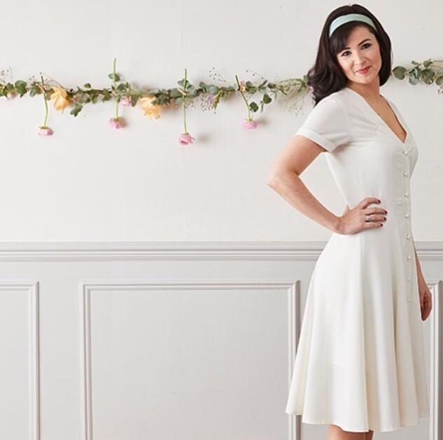 DE: Ich habe mich entschieden Version 2, mit den gefühlten 3 Meilen gekräuselten Röcken zu nähen. Laut meinen Maßen hätte ich die Größe 40 nähen müssen, aber da ich nicht wollte, dass das Kleid so groß wird und ich darin schwimme, habe ich beschlossen es in Größe 38 zu nähen. Auch habe ich wie Fiona Taillen-Bänder genäht um die Passform an meiner Taille zu optimieren. Die Knöpfe stammen aus meinem Lager, ich weiß leider nicht mehr wo ich sie gekauft habe… SORRY! Ich habe außerdem das Oberteil um 2 Zoll verlängert, da es sonst viel zu kurz gewesen wäre.