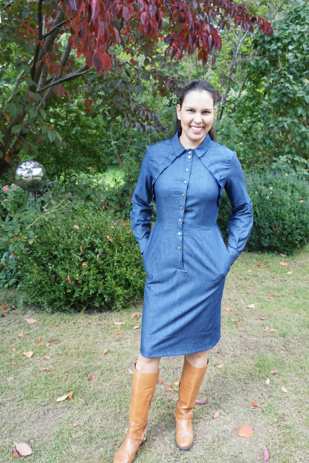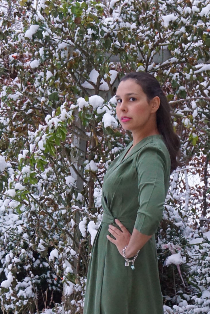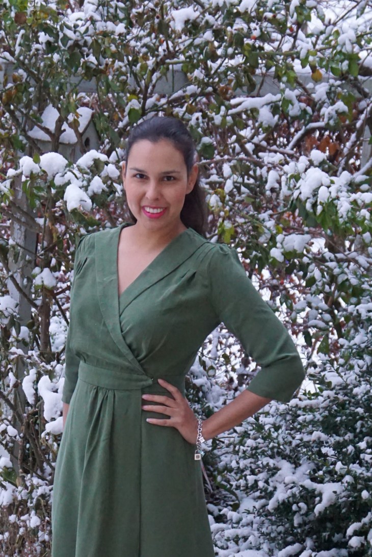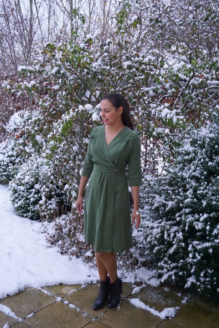 DE: Ich habe die Größe 10 gewählt und das Kleid um 2 Inch verlängert, auf den Modellbildern kam mir das Kleid etwas kurz vor und ich wollte es gerne in die Arbeit anziehen. An der Passform habe ich sonst nichts ändern müssen. Die ¾ Ärmel gefallen mir auch sehr gut, und machen das Kleid schon sehr wintertauglich. Ich habe einen Krepp-Stoff von Stoff und Stil verwendet, den ich letzten Dezember, als meine Freundin Victoria mich besucht hat, gekauft habe. Ich glaube, das nächste Mal werde ich dafür einen etwas festeren Krepp verwenden oder vielleicht eine festere Baumwolle.