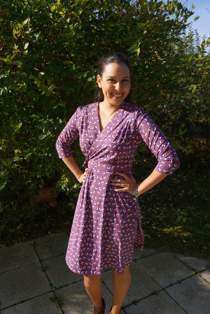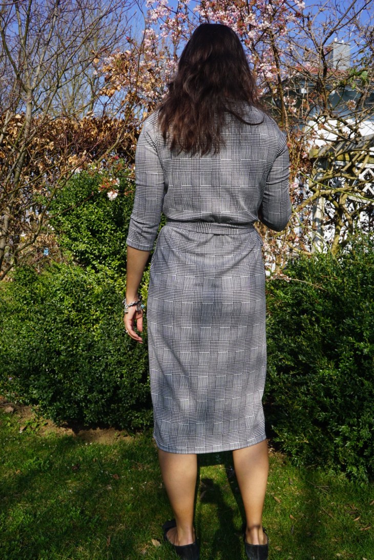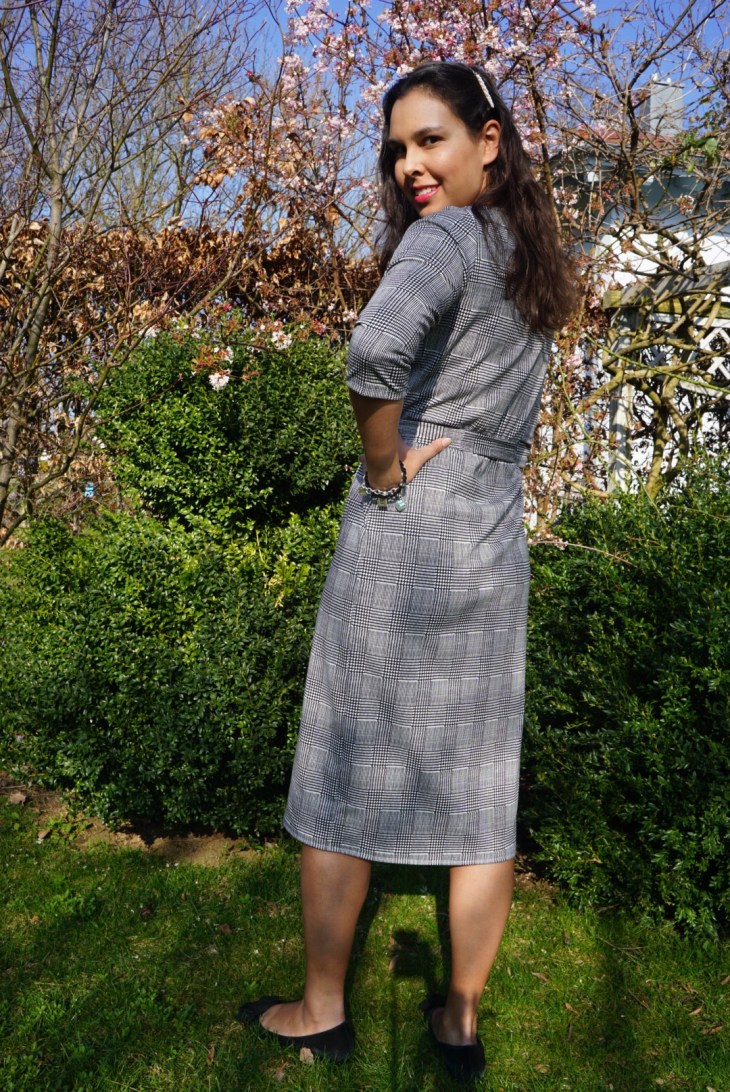 EN: Good morning, everyone! Spring is finally here to stay (or at least I hope it is!). When I chose my fabric for this make, I was pretty sure, that it was still going to be freezing and possibly snowing, which is why I wanted to make the Athina Kakou Abi Jumpsuit . However, the beautiful Hounds tooth Ponte arrived, I decided that it was a lot of print for a jumpsuit! Also, I was really worried about matching up the print on the wrap bodice and the trousers and the waist and the back…you get the idea.And before I started tearing out my hair, Athina Kakou went and released her brand new dress pattern, the Suzy Dress . “Now that’s an effortless pattern I can get behind”, I thought to myself. The dress, a simple sheath style dress with a mock wrap skirt, waist tie and a choice of a boat neck or scoop neckline is really quick and easy to make up. It looks really stylish in a plain color and fun in a print – and it definitely falls in the secret pajama category!