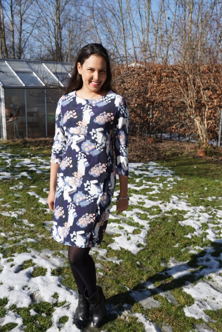 EN: I made up the dress in a size 10 and lengthened the hem by 2 inches, as the dress looked a bit short on Lisa and I really wanted to be able to wear the dress at the office. I didn’t make any other adjustments to the dress. I really like the ¾ sleeves, that make the dress quite winter appropriate. I used a lovely crepe from Stoff and Stil, that I bought in December, when my friend Victoria was over for a visit. I think I might use a triple crepe next time or thicker cotton as I feel that the fabric I chose is a bit too thin.