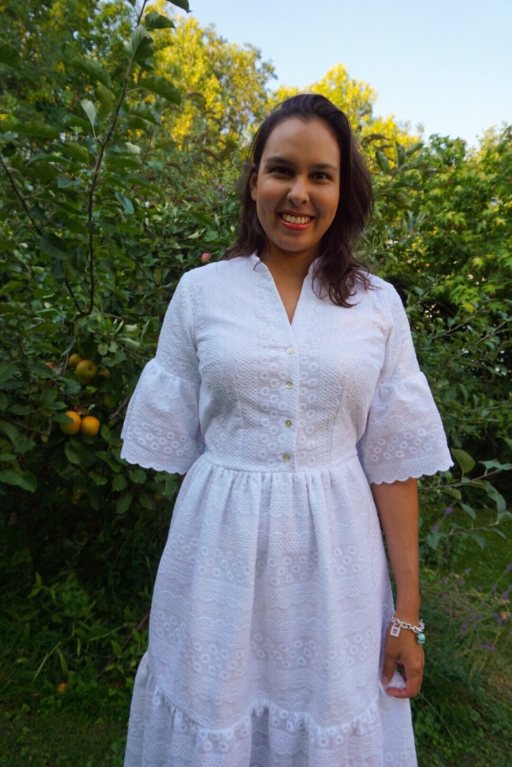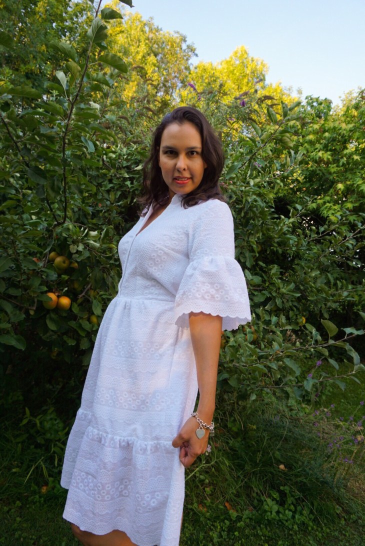 EN: Let’s get down to business with my second Myosotis Dress from Deer and Doe. I bought the fabric at the Birmingham Rag Market 2 weeks ago, where I was also able to meet up with some of my lovely sewing friend. I’m not going to lie, I bought 13 pieces of fabric and added nearly 30 meters of fabric to my stash, that I would like to turn into garments in autumn. I was however, able to close my suitcase and didn’t have to disguise 4 meters of viscose… as a scarf again. LOL! Anyway, this Broderie Anglaise was the most expensive fabric I bought that day, costing whopping 5 GBP a meter (you may laugh now!) Since I purchased 3 Meters, making this dress cost me exactly 15 quid, which is probably the best 15 quid I spent this year!!