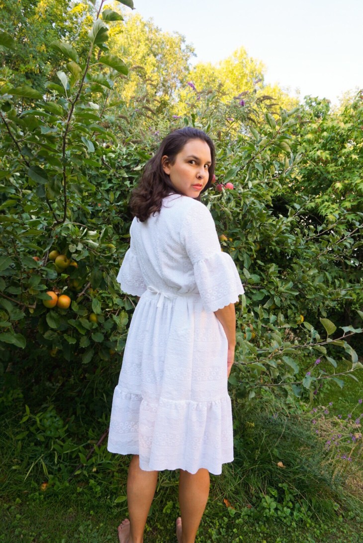 EN: Like my first version, I chose to sew up in the pattern in a size 38 and lengthened the bodice by 2 inches. I also added ties on the side to bring the dress in a bit. I also used a pair of sharp embroidery scissors to cut out the scallop edge of the sleeves and am still kicking myself, that it didn’t think to do the same for the flounce of the skirt… which would have saved me the time of hemming it! Unfortunately, I realized the potential for this, after I had cut out all the pieces and then didn’t have enough fabric to recut the flounce… LE SIGH