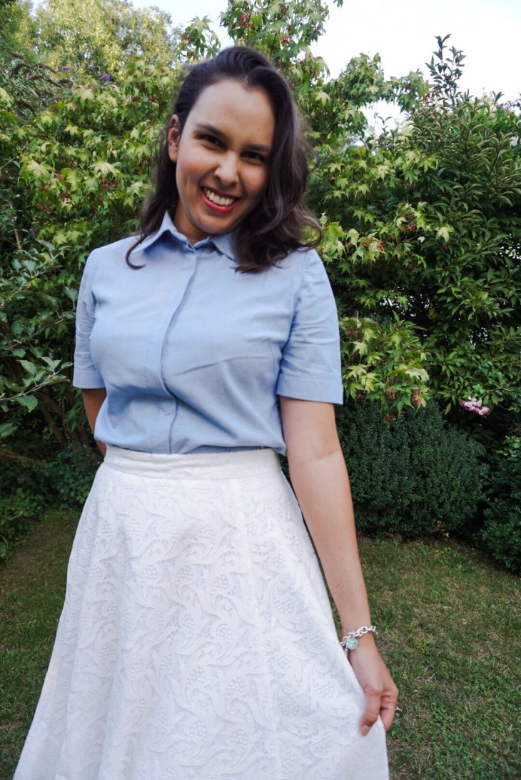DE: Daher gibt es heute die Kate Bluse und den Kate Rock zu sehen! (das Kate Kleid zeige ich euch dann nächste Woche, wenn ich am Wochenende wieder neue Bilder geschossen habe!) Die Kate Bluse habe ich in Größe 12 aus einem leichtem Chambray genäht. Ich habe die Bluse um 2 Zoll verlängert, da sie mir schonst zu kurz geworden wäre (da ich meine Blusen grundsätzlich immer einstecke, wäre das ein Problem gewesen…) Ich habe die Bluse mit Französischen Nähten genäht, was für ein sehr schickes Innenleben der Bluse sorgt und habe den Saum der Bluse (und den Saum der Ärmel) mit Querband versäubert.