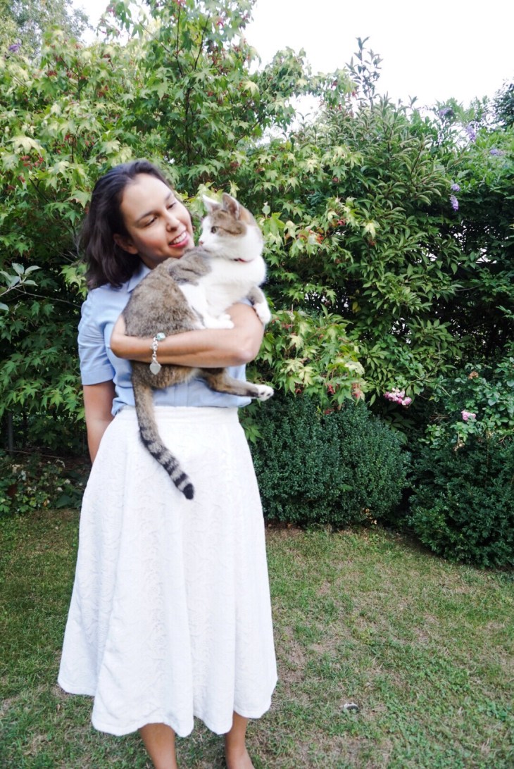 DE: Ich habe einen leichten Leinenstoff verwendet, der sich super verarbeiten ließ. Traurig bin ich nur, dass ich nicht genug Stoff hatte um einen Gürtel aus dem gleichen Stoff zu nähen, wobei dieser rote Gürtel eigentlich echt super dazu passt. Ich habe übrigens, das Oberteil mit einem leichten Baumwollbatist gefüttert, ich hatte etwas Angst, dass der Leinen sonst ein wenig ausleiert. War meiner Meinung nach eine gute Wahl und wieder sind Stoffreste au meinem Lager aufgebraucht =) DER SOMMER KANN KOMMEN!!!! Mein Kater wollte eigentlich nicht so gerne mit aufs Bild, er hat im Augenblick kann schlimm mit Juckreizekzemen zu kämpfen (sieht man unter seinem Kinn) aber für 2 Bilder hat er dann doch etwas genervt in die Kamera geguckt. HAHAHAH Armes Ding. Ich wünsche euch noch eine tolle Woche, weitere gut gekleidete Damen findet ihre heute bei
