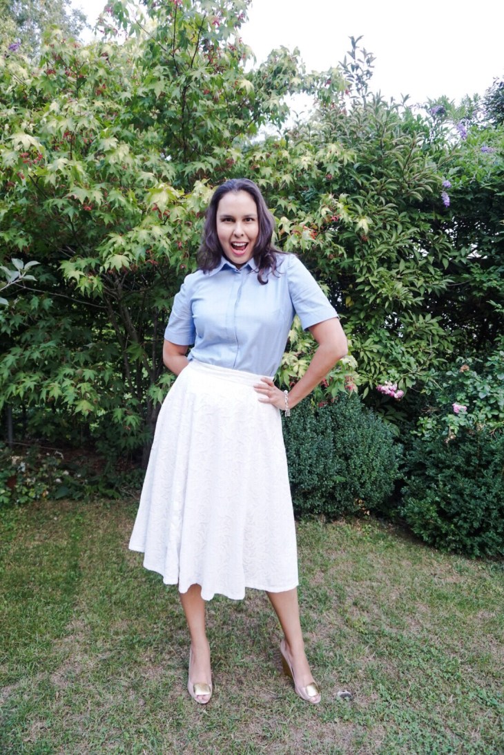 DE: Der Kate Rock, den ich in Größe 12 genäht habe, besteht aus 6 Einzelteilen, man kann den Rock außerdem mit einem Schlitz nähen, was ich nicht gemacht habe… da ich es leider immer schaffe in Situationen zu gelangen bei denen ein Schlitz im Rock unvorteilhaft ist. UUPPS!! Genäht habe ich den Rock aus einer weißen Spitze, den ich mit meiner Mama letzten März am Birmingham Ragmarket gekauft habe. Da die Spitze allein aber sehr durchsichtig gewesen wäre habe ich sie mit meinem
