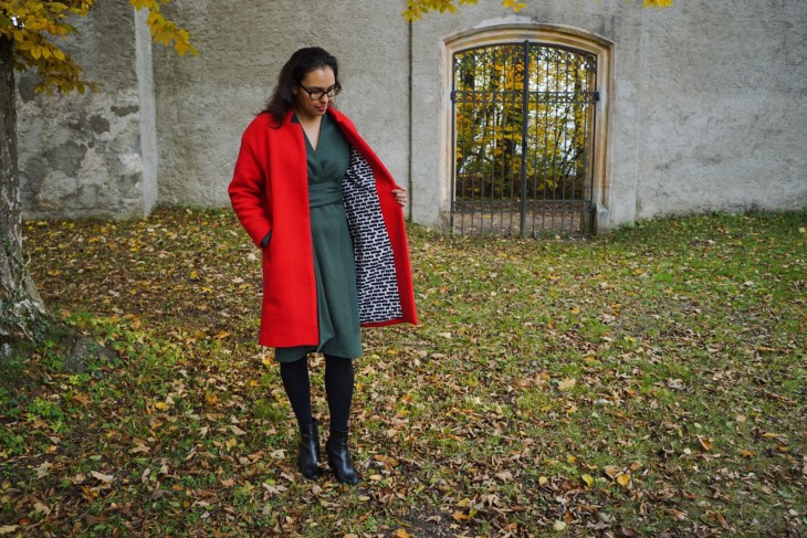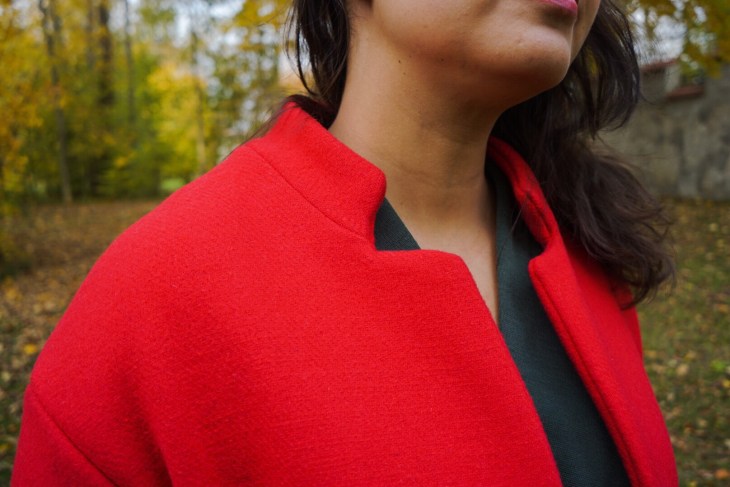 EN: I lined the coat with Art Gallery poplin and satin in the sleeve, which makes getting in and out of the coat easy. I’m quite happy with the color combo of the red coating with the black and white lining. I hand sewed on a snap, that the lovely