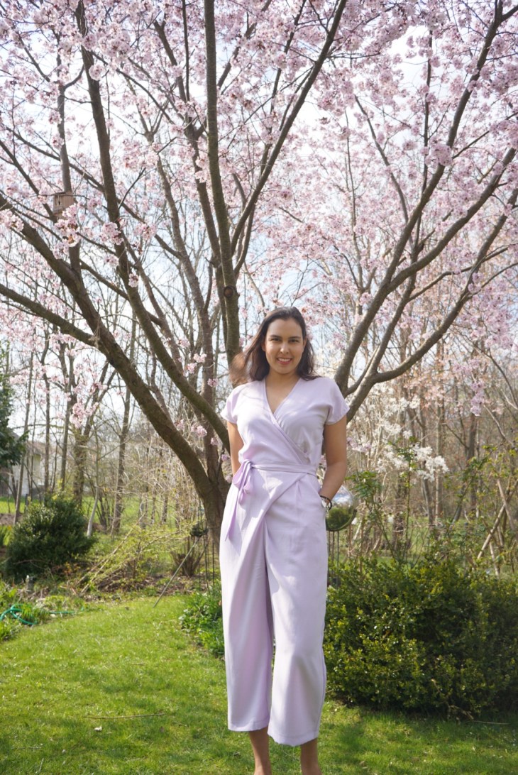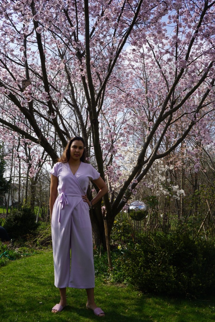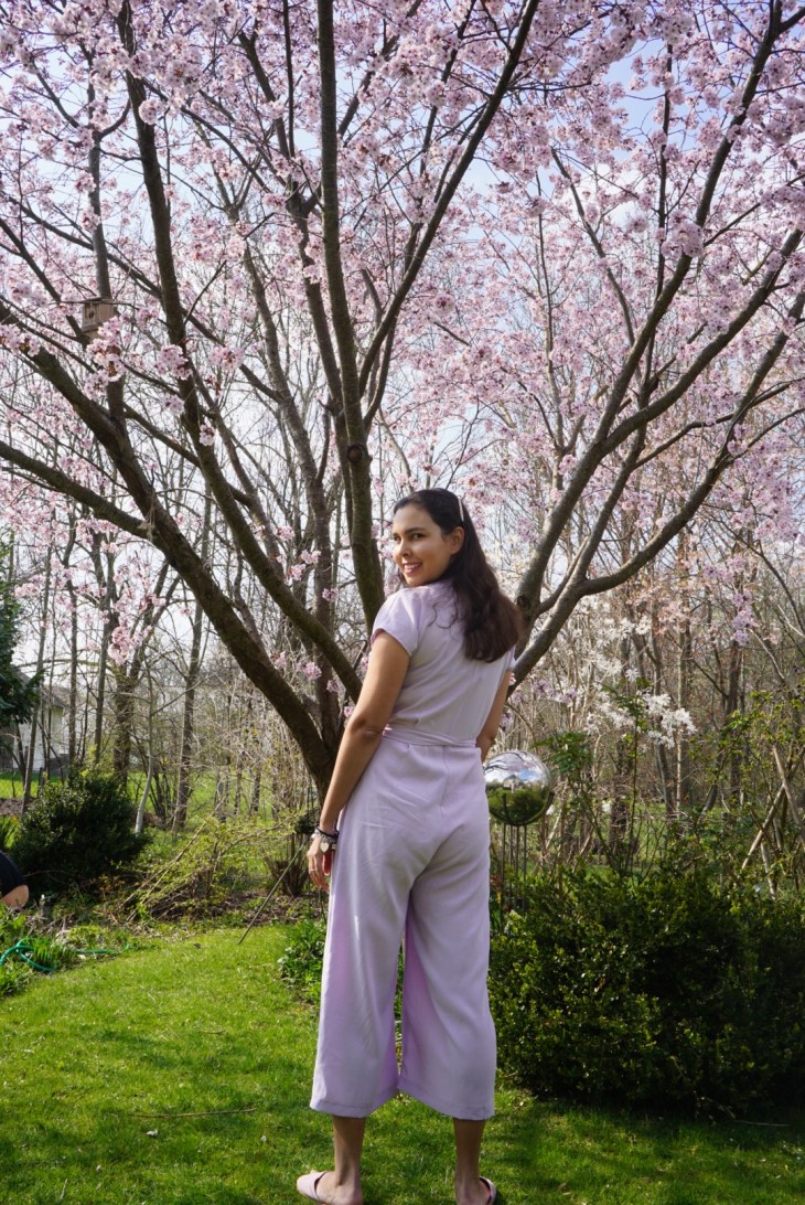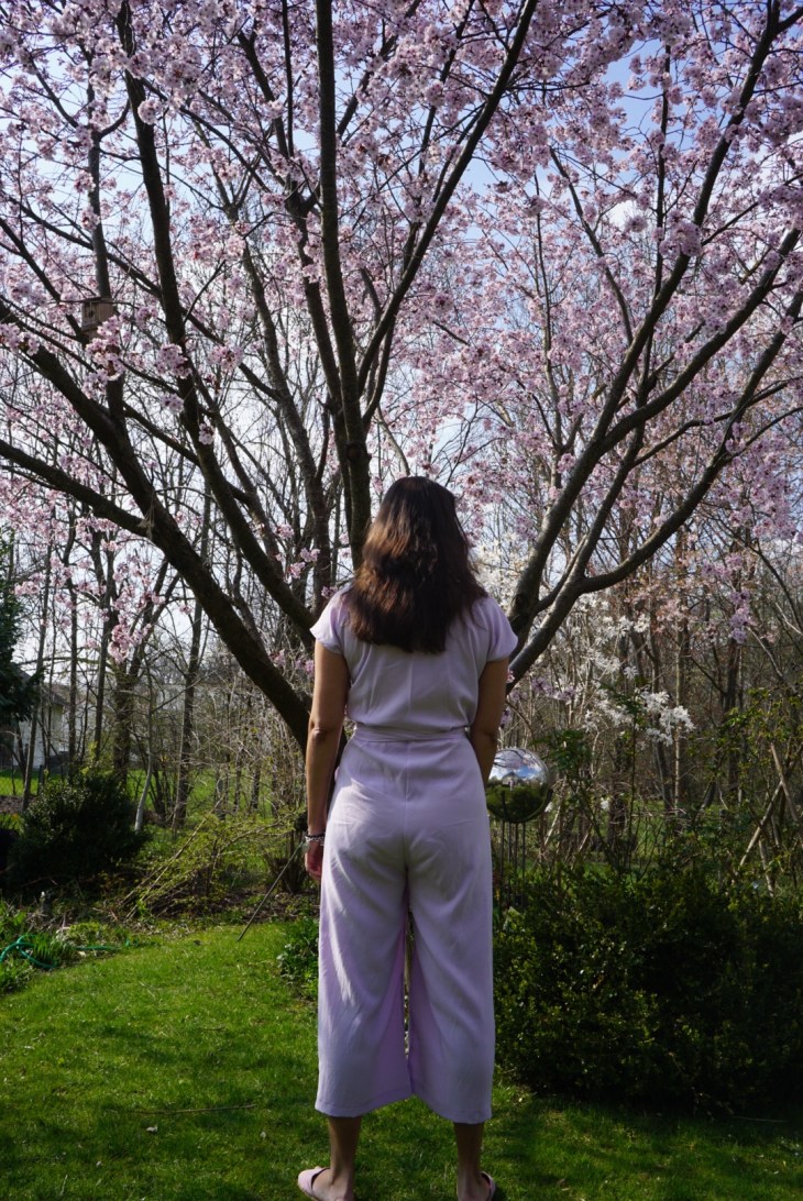 EN: When I finished the jumpsuit, I really wasn’t feeling it at all. My partner gave me the “you-re-not-going-to-wear-that-in-public-are-you” look but after spending an entire day prancing about in it… I’m kind of in love. It’s effortless, modern and even a little chic that being said, I wouldn’t wear it to the office, because it’s a bit too informal. I also FINALLY managed to take pics in front of the cherry tree in spring! I have never managed this feet, either I was away when the tree was blooming, or I had nothing to show you or the weather was terrible! I shall file this under success!