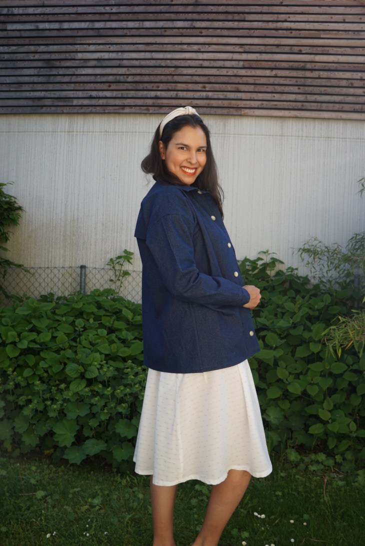 EN: I had the perfect fabric already in my stash, an indigo denim fabric I’ve had for years. I did however make some adjustments to the pattern before cutting into the fabric. First of all I added width to the pocket, so that it lined up with the front bodice edge and then added 4 inches of height to the pocket. I then cut off nearly 5 cm of the front bodice edge and cut both button bands in the fold, so that the button band would be a wide as the Will Jacket. I sewed the pleat in the back, attached the pockets to the front, and the front to the back and attached the sleeves… and then I’m really not sure what happened! It took me barely 1,5 hours to finish this jacket, which included closing the sides, hemming the jacket, sewing buttonholes and sewing on buttons.